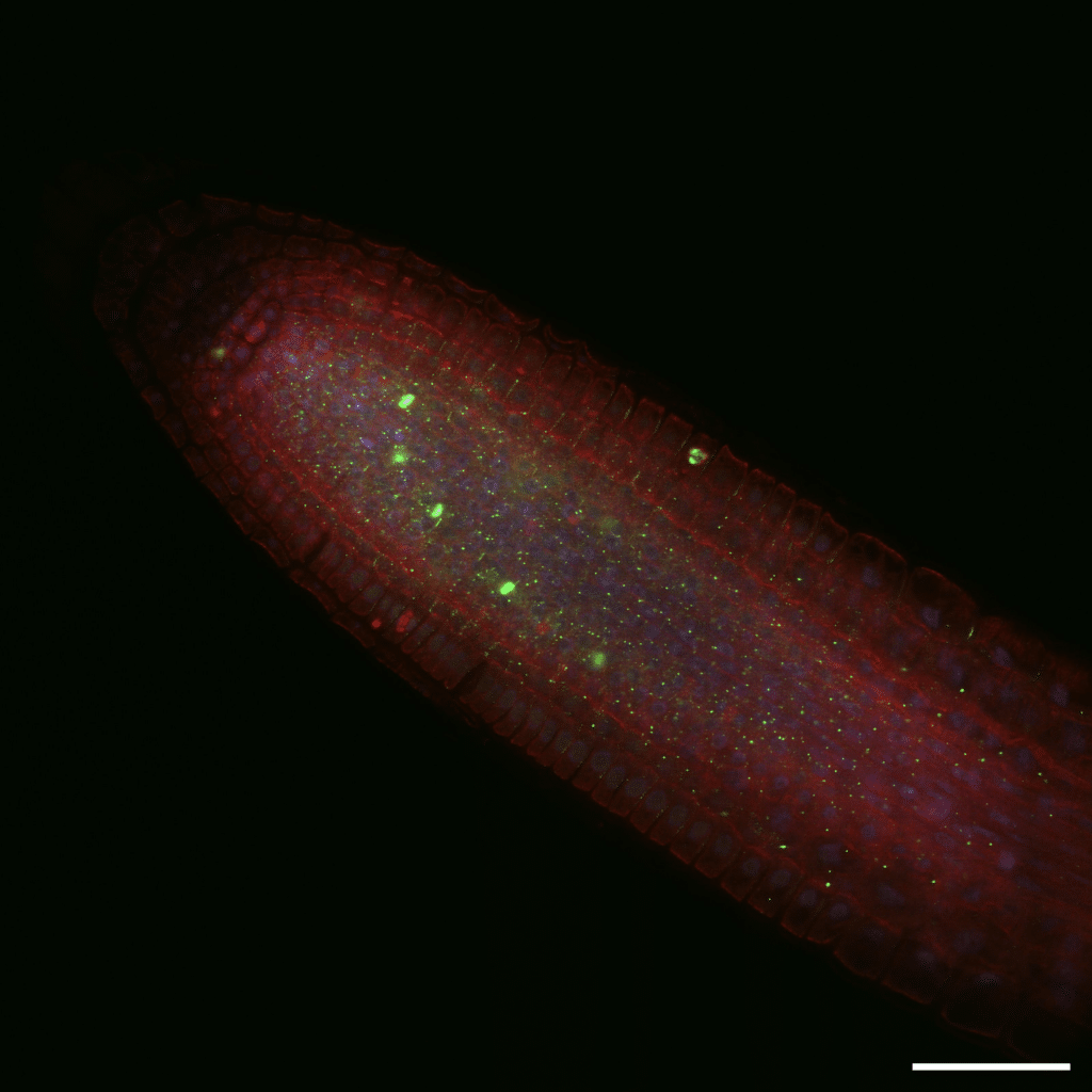 Root of A. thaliana. Nucleus – DAPI, Histone H3 – Alexa488, Tubulin – Cy3. Scale bar 50um.