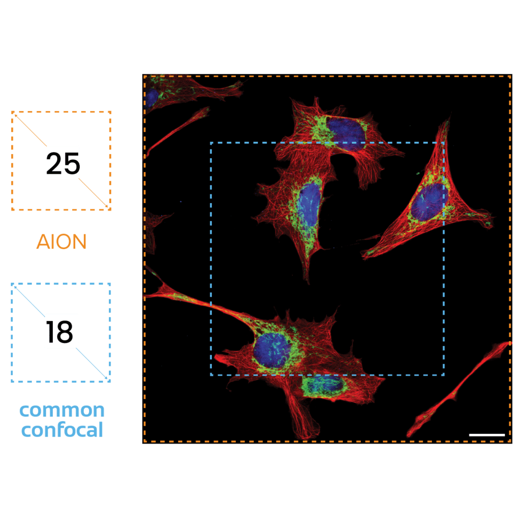 AION is a confocal system that allows a 25 mm field of view (FOV) with a motorized pinhole that ensures spot on confocality every time.
